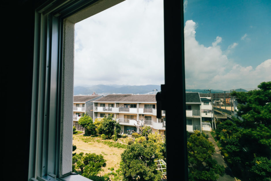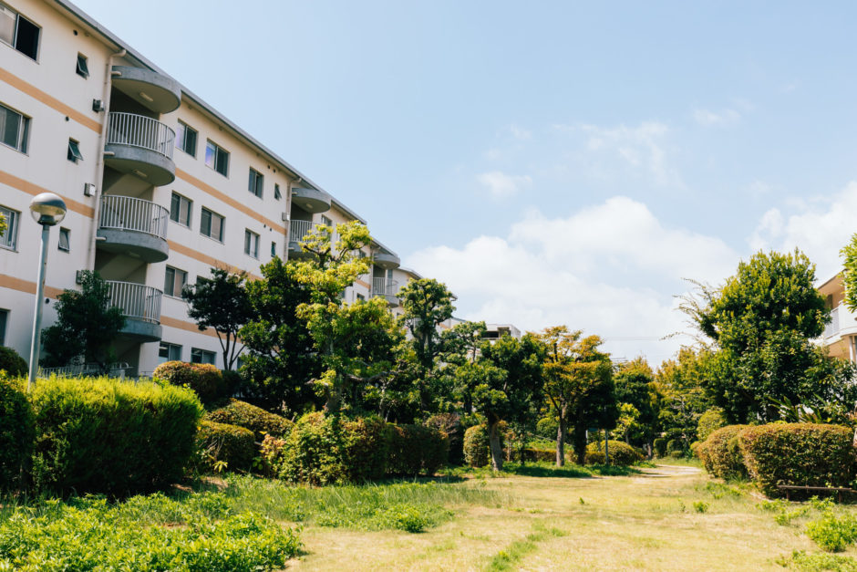 大東町住宅は、築38年と比較的新しい市営住宅です。さすがは芦屋市、担当の島津さん曰く「周辺地域になじむよう、頑張っていいものをつくる傾向にあった」そうで、外観はちょっとおしゃれな雰囲気。