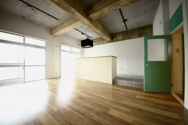 アイランドキッチンが嬉しい、広い1LDKのお部屋です。コンクリートの梁がかっこいい!!